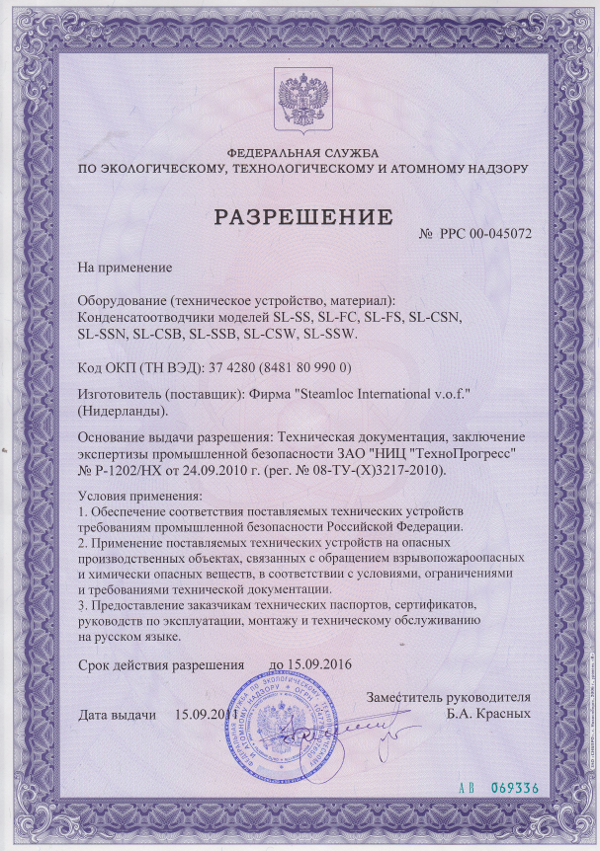 Nov. 2011: Steamloc International is proud to announce it has received Russian GOST-R approval for its high quality condensate removal products. This means that Steamloc is certified for the Russian Federation.